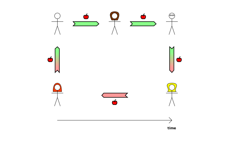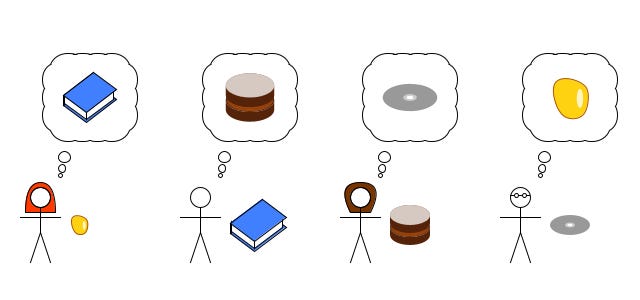 ![[1] (TT) Bob→Alice {book}. (TD) Alice→Bob {£10 (cash)}. [2] (TT) Charlotte→Bob {cake}. (TD) Bob→Charlotte {£10 (cash)}. [3] (TT) Dom→Charlotte {DVD}. (TD) Charlotte→Dom {£10 (cash)}. [4] (TT) Alice→Dom {amber}. (TD) Dom→Alice {£10 (cash)}. [1] (TT) Bob→Alice {book}. (TD) Alice→Bob {£10 (cash)}. [2] (TT) Charlotte→Bob {cake}. (TD) Bob→Charlotte {£10 (cash)}. [3] (TT) Dom→Charlotte {DVD}. (TD) Charlotte→Dom {£10 (cash)}. [4] (TT) Alice→Dom {amber}. (TD) Dom→Alice {£10 (cash)}.](https://substackcdn.com/image/fetch/$s_!ex8C!,w_1456,c_limit,f_auto,q_auto:good,fl_progressive:steep/https%3A%2F%2Fsubstack-post-media.s3.amazonaws.com%2Fpublic%2Fimages%2Fe6d5d61b-9c55-4073-b2fa-f4658056fb03_560x560.png)