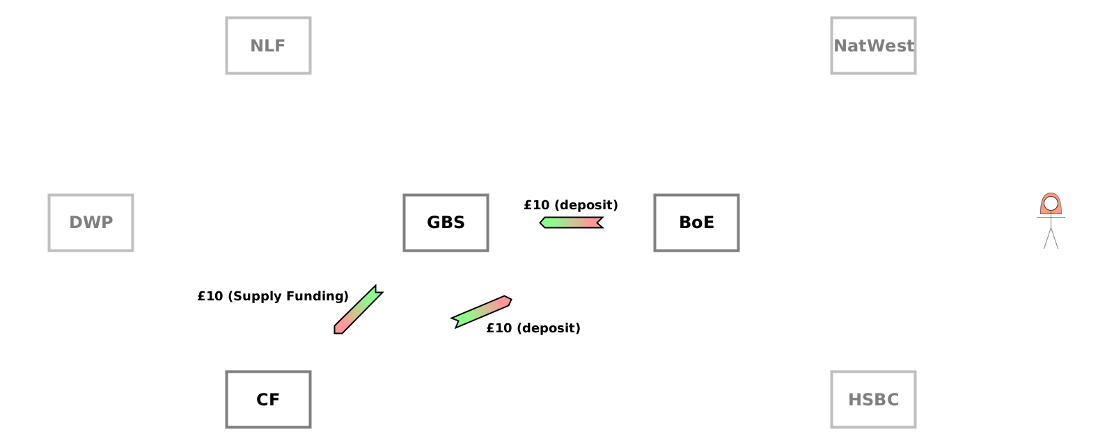 This step works a bit like a bank withdrawal. The CF had promised (“supply funding”) to pay the GBS £20, and GBS now wants £10 of this, so it gives up £10 of its supply funding in exchange for £10 of public deposits in its PMG Drawing account. The CF obtains the £10 from the BoE.