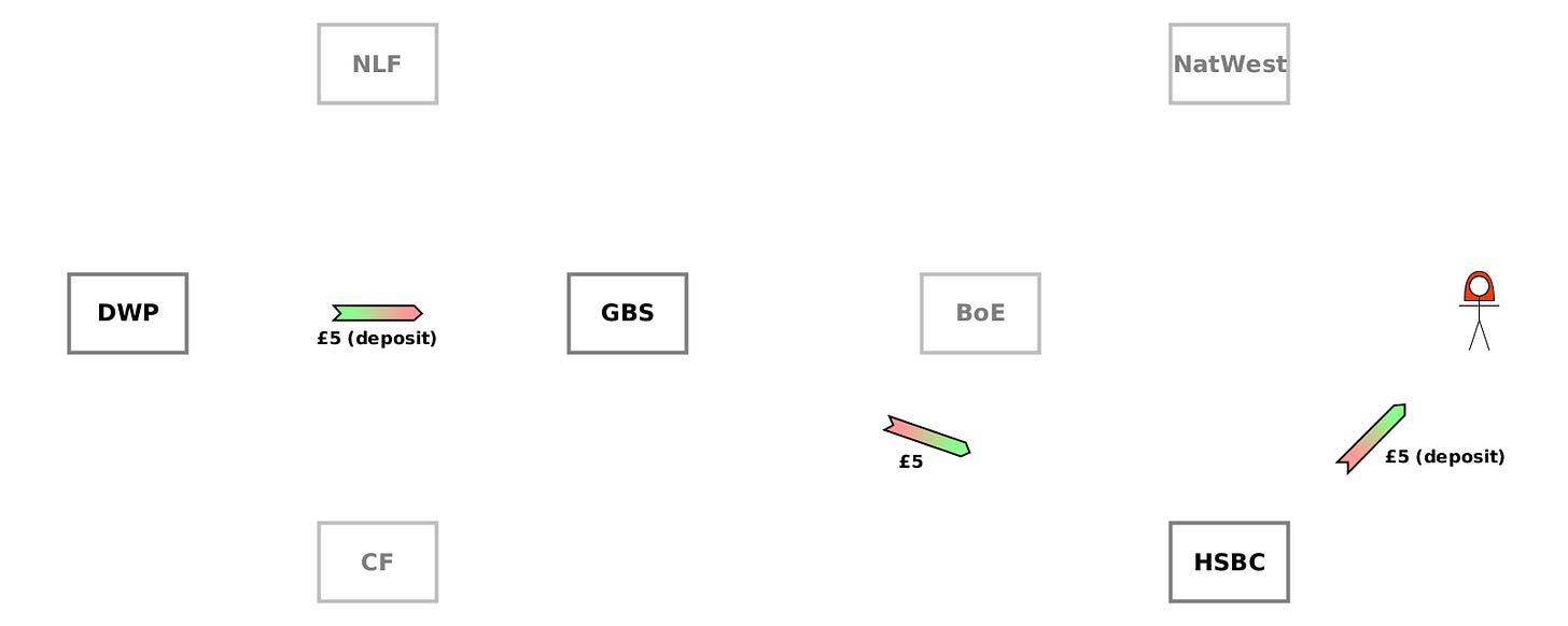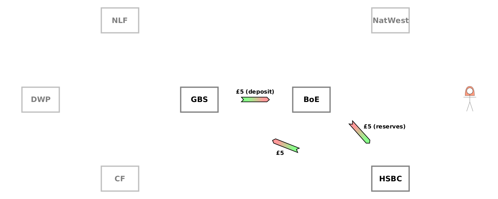 If we combine all the steps, two actions cancel each other out: GBS promising to pay HSBC £5 (in step 1) and HSBC writing off that debt when it has been settled (in step 3). Also, the transfer of £10 from BoE to GBS (in step 2) is partially offset by a transfer of £5 from GBS to BoE (in step 3). This leaves the following diagram, which might seem complicated at first: