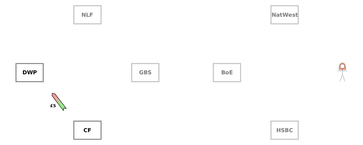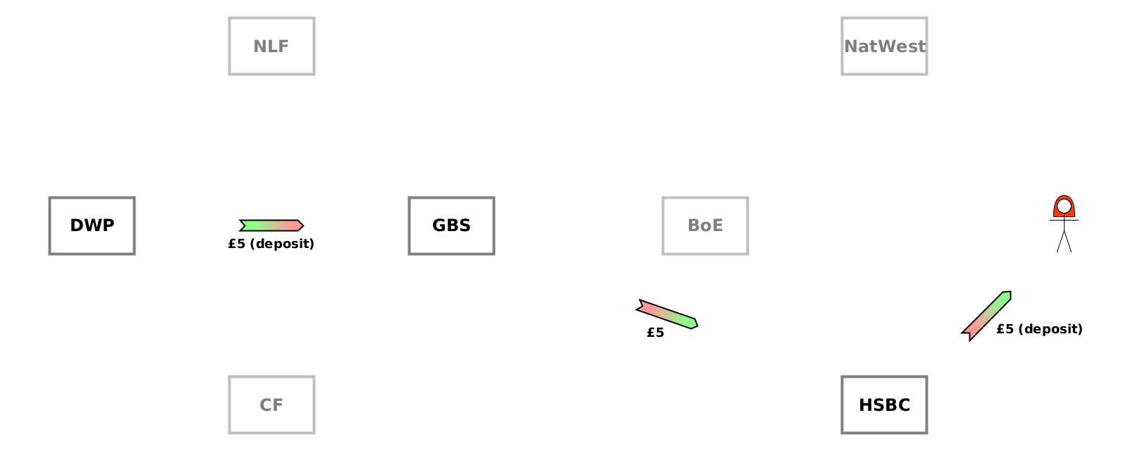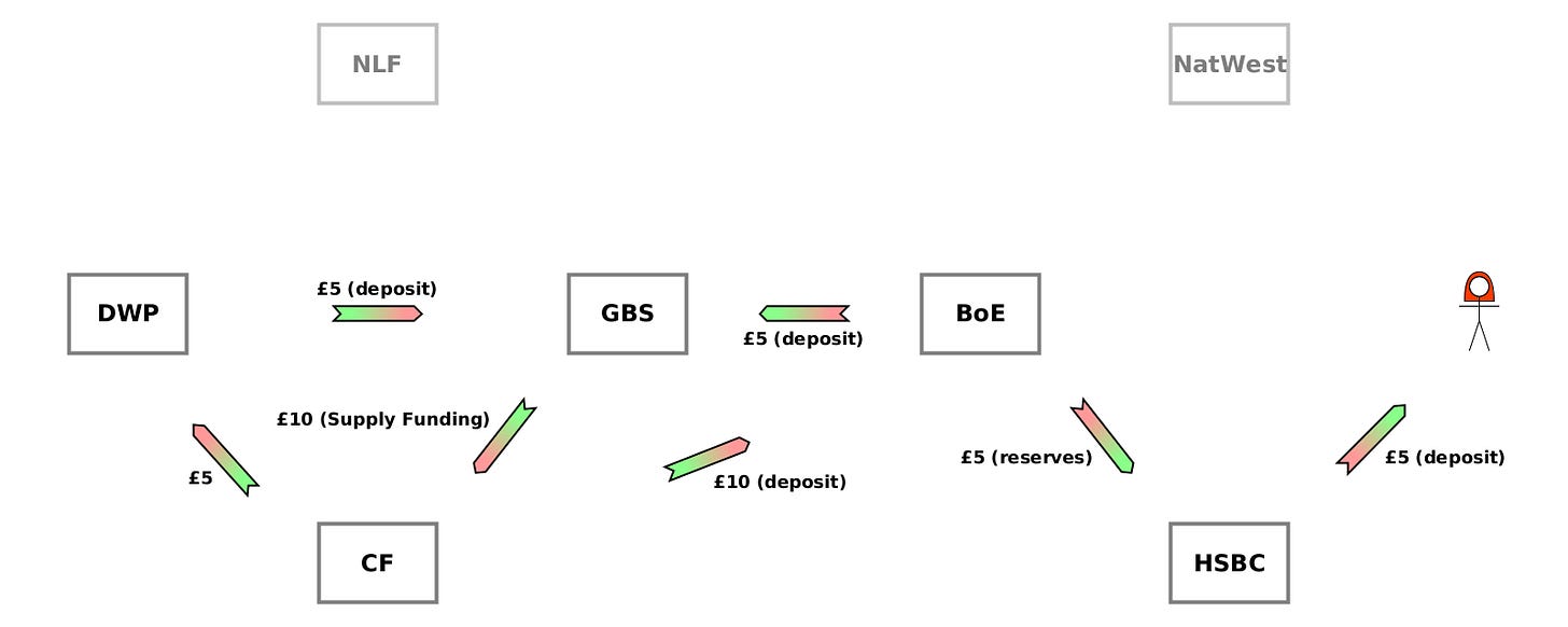 This is another settlement with 3 economic actions. Two for the transfer of £5 from the GBS PMG Drawing account to HSBC (via the BoE), and one for HSBC writing off GBS’s promise to settle the debt resulting from DWP’s earlier £5 payment to Alice.