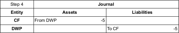 As mentioned above, before the start of this scenario, DWP had promised to pay its allocated £20 back to the CF if it didn’t end up spending it for the authorised purpose. But now that the DWP has spent £5 of it, the CF writes off £5 of that debt owed to it by the DWP.