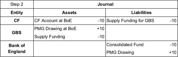 There are 3 economic actions. Two for the transfer of £10 from the CF to GBS’s PMG Drawing account (via the BoE), and one for GBS writing off £10 of the CF’s “supply funding” debt, since the CF has now kept its promise.