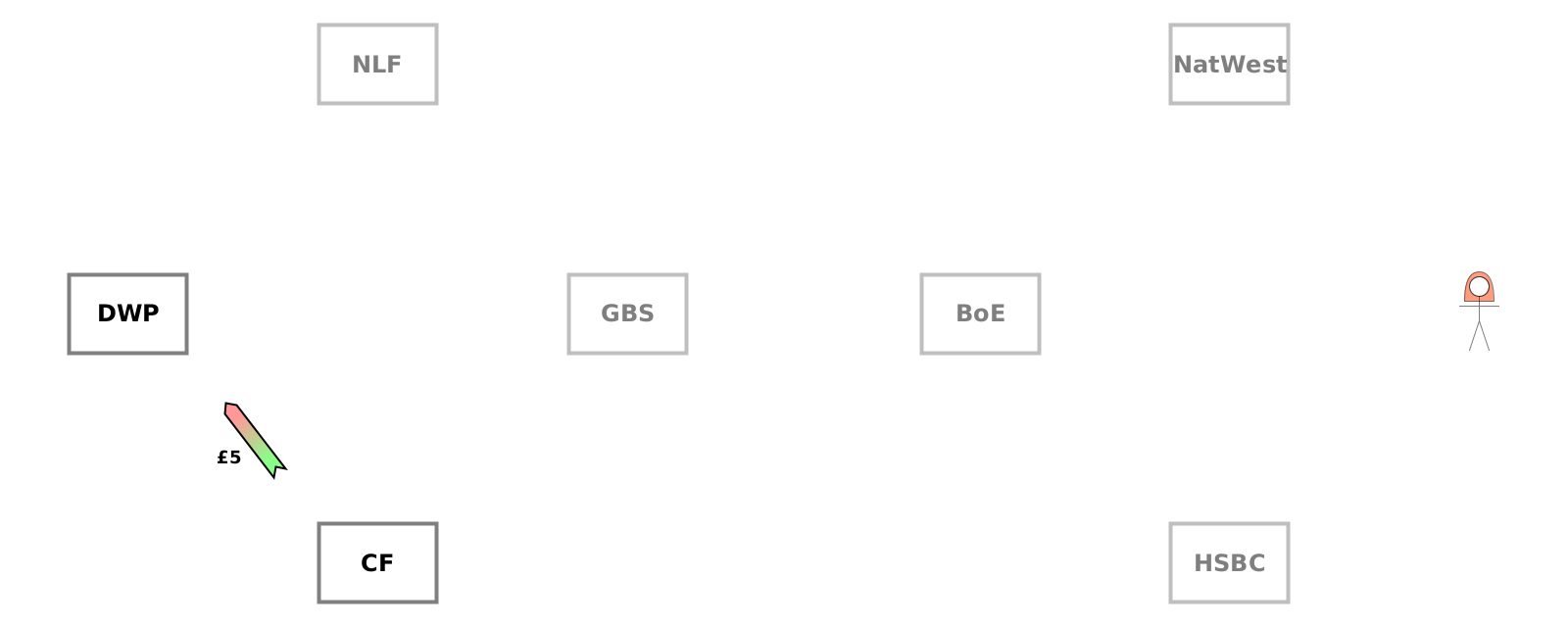 Notice that, even though this is now the third article about chapter 5 of the BTW study, this is the very first diagram in which anyone’s RNW changes. (DWP’s RNW↓ and Alice’s RNW↑). Until this point, RNW was only being transferred around a loop. This is the first significant economic activity of government spending. DWP is transferring £5 of its RNW to Alice indirectly, via GBS and HSBC.