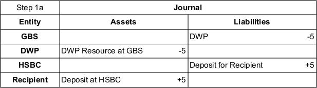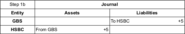 Step 1a is the decrease in DWP’s deposits with GBS and the increase of Alice’s deposits with HSBC. Step 1b shows GBS promising to settle with HSBC later. Together, this works just like the transfer from Alice to Charlotte in section [4.2] (see here).