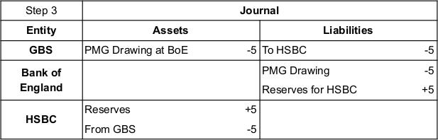 So far, GBS has only promised to pay HSBC. It will need something in the PMG Drawing account to transfer to HSBC to actually make the payment. In step 2, as we saw in step 2 of section [5.1], the CF transfers some of the balance in its account at the BoE (borrowing it from the BoE if it doesn’t have enough).